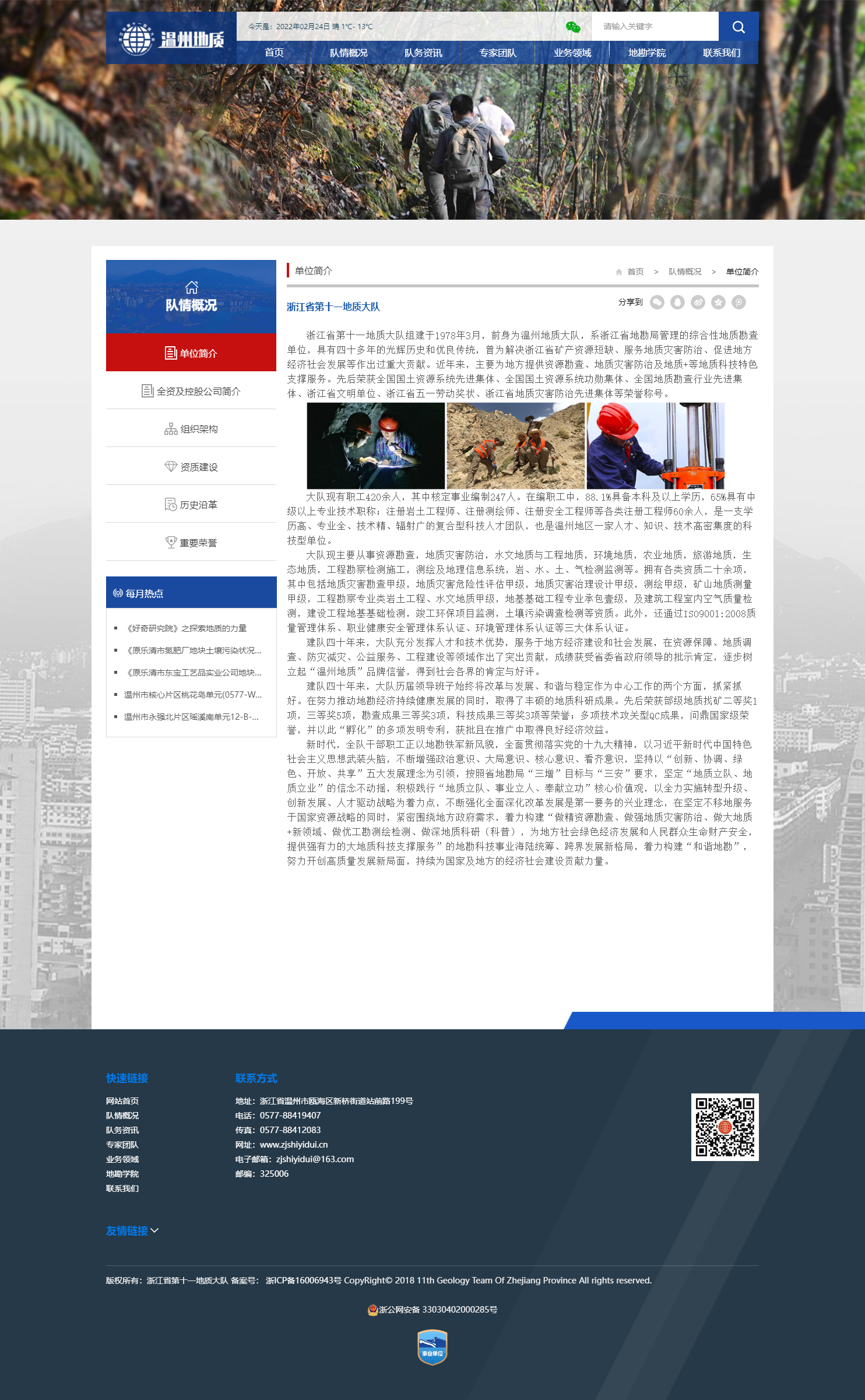 浙江省第十一地質(zhì)大隊組建于1978年3月,前身為溫州地質(zhì)大隊,系浙江省地勘局管理的綜合性地質(zhì)勘查單位,具有四十多年的光輝歷史和優(yōu)良傳統(tǒng),曾為解決浙江省礦產(chǎn)資源短缺、服務(wù)地質(zhì)災(zāi)害防治、促進地方經(jīng)濟社會發(fā)展等作出過重大貢獻。近年來,主要為地方提供資源勘查、地質(zhì)災(zāi)害防治及地質(zhì)+等地質(zhì)科技特色支撐服務(wù)。先后榮獲全國國土資源系統(tǒng)先進集體、全國國土資源系統(tǒng)功勛集體、全國地質(zhì)勘查行業(yè)先進集體、浙江省文明單位、浙江省五一勞動獎狀、浙江省地質(zhì)災(zāi)害防治先進集體等榮譽稱號。