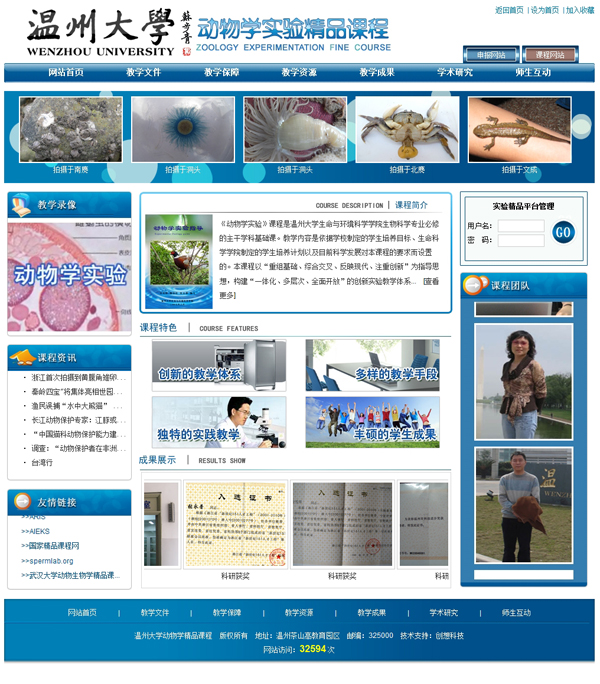 我公司為溫州大學(xué)生命與環(huán)境科學(xué)學(xué)院,建立的動物學(xué)實(shí)驗(yàn)精品課程網(wǎng) 經(jīng)浙江省教育廳評審,被評為浙江省高等學(xué)校省級精品課程網(wǎng)站。這也是我公司開創(chuàng)了第一個(gè)省級精品課程網(wǎng)。同時(shí)也慶祝公司在精品課程網(wǎng)站制作方面更上一個(gè)新的臺階,同時(shí)希望以后能夠?yàn)楦叩仍盒7?wù),創(chuàng)立更好的網(wǎng)站。